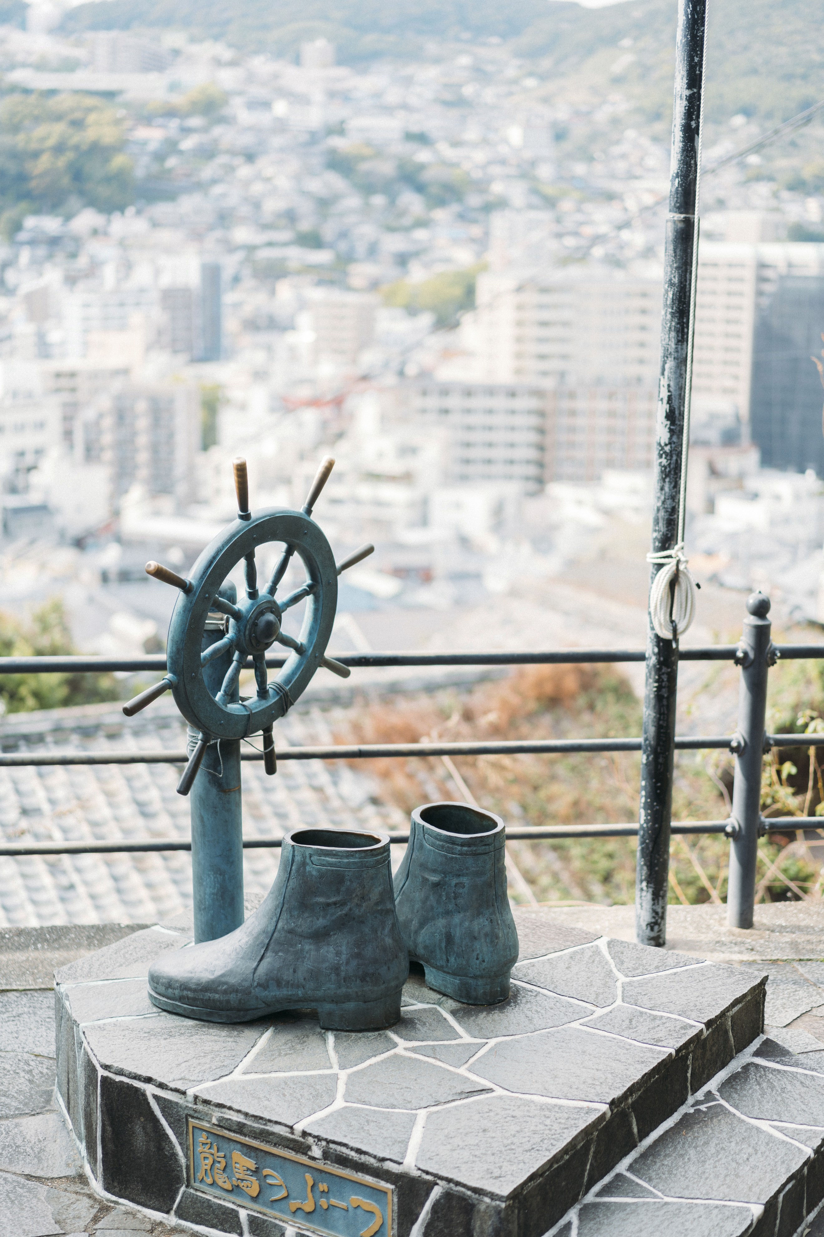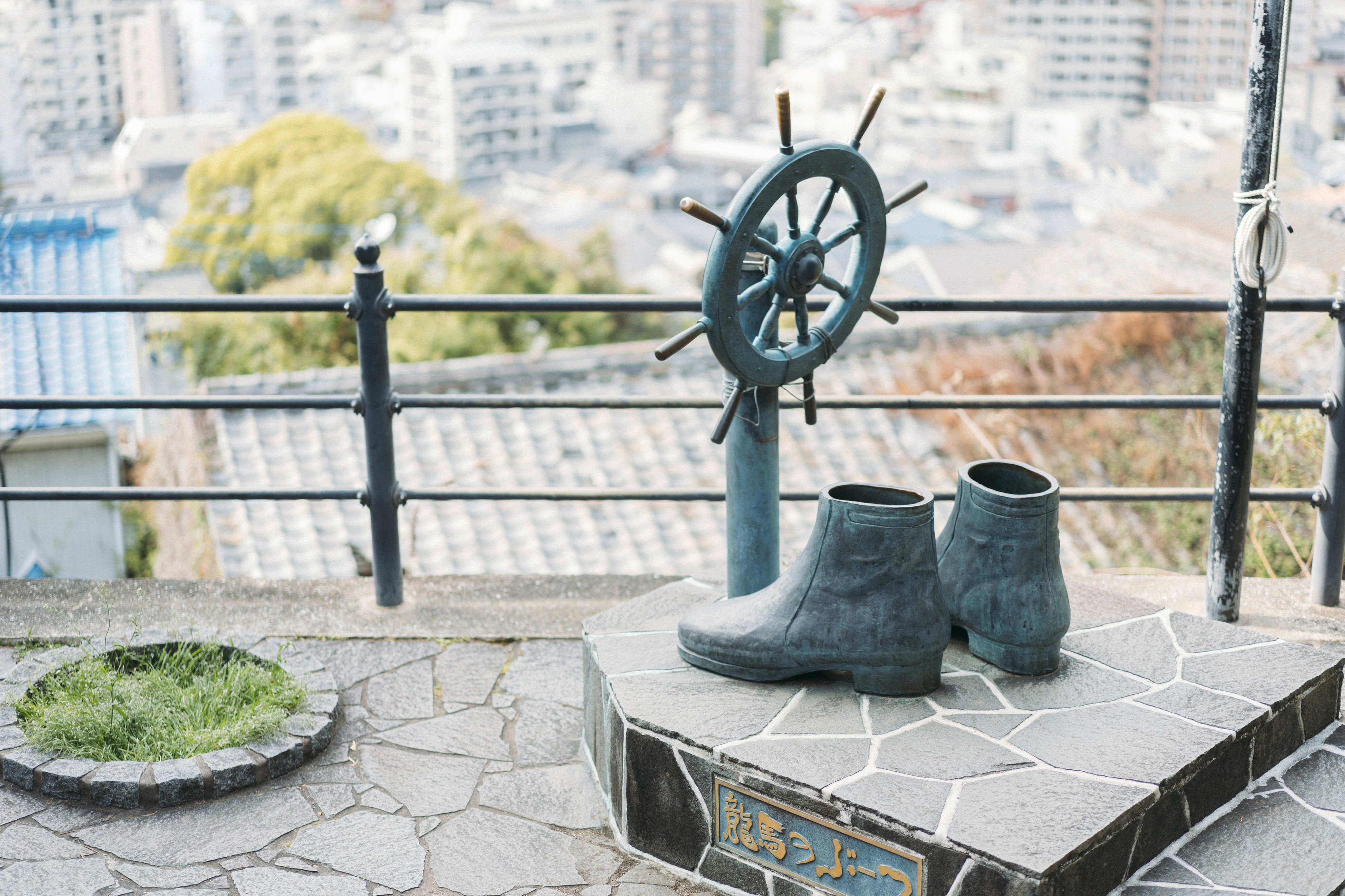 亀山社中から歩いてすぐにあるブロンズ製の「龍馬のぶーつ」。亀山社中創設130周年を記念して建立された、実際に履くことができる体験型オブジェです。